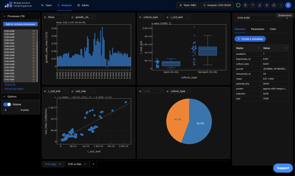 Both and beyond. You can begin with post-hoc analysis to uncover trends, root causes, and optimization potential. As you grow, the platform supports real-time monitoring to detect deviations early and guide immediate decisions. With predictive models, Bioprocess Intelligence also helps you anticipate outcomes and plan smarter experiments before issues arise.